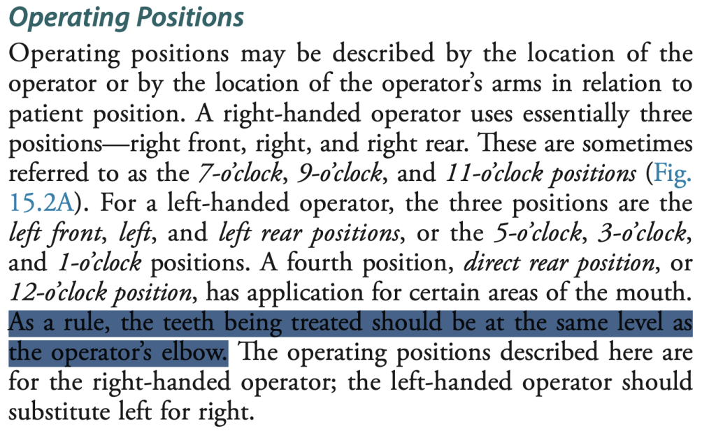 - แต่อาจพิจารณาระยะสายตาที่เหมาะสมร่วมด้วย คือ หากปรับต่ำเกินไป จนเกินระยะโฟกัสของสายตา อาจทำให้เห็นรายละเอียดได้ไม่ชัด ส่งผลให้ทำงานได้ยากและช้าลง ดังนั้น อาจปรับตำแหน่งผู้ป่วยให้สูงขึ้นกว่าศอกเล็กน้อย เพิ่อเพิ่มความชัดเจนของฟัน