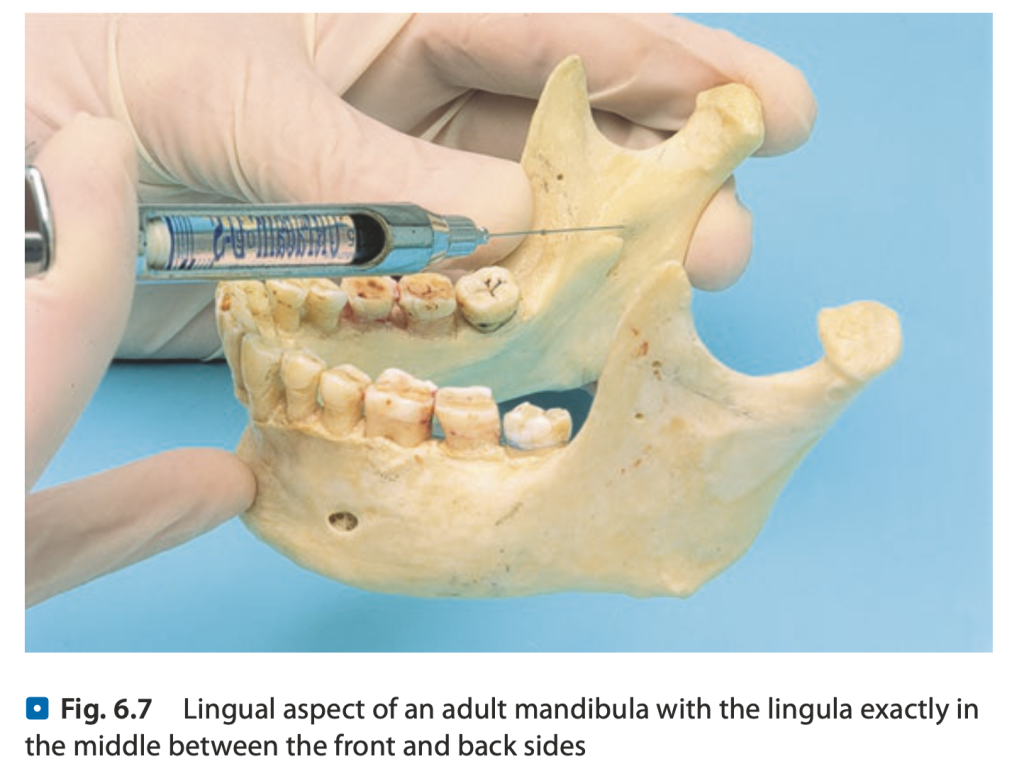- ปลายเข็ม ควรจะมีการชน bone ในระยะที่เหมาะสม เพราะ รูเปิดของ nerve(lingular) จะอยู่บน bone การที่เข็มอยู่ใกล้ bone จะทำให้ยาชาไหลไปโดน nerve เร็วขึ้น คนไข้ชาเร็วขึ้น พอชน bone แล้วจึงถอนเข็มเล็กน้อย และ inject ยาชา