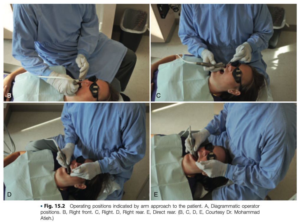 - ปากคนไข้อยู่ระดับข้อศอก หรือต่ำกว่าเล็กน้อย วิธีสังเกตง่ายๆคือ ศีรษะคนไข้ จะคล้ายกับว่ากำลังหนุนอยู่บนตักเราพอดี(ตรงกับตำรา Sturdevant’s – มีภาพอ้างอิงที่ข้างล่าง)